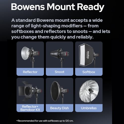 - [Bowens Mount Ready] A standard Bowens mount accepts a wide range of light-shaping modifiers-from softboxes and reflectors to snoots – and lets you change them quickly and reliably.