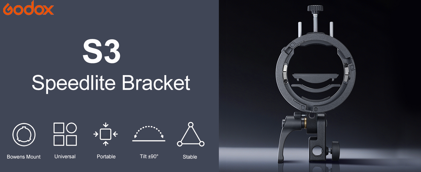 The S3 Speedlite Bracket-redesigned to be more compact and to speed up lighting setup. This universal bracket accepts a wide range of on-camera flashes and outdoor flashes, installs quickly and securely, and supports Bowens-mount modifiers for expanded creative possibilities.