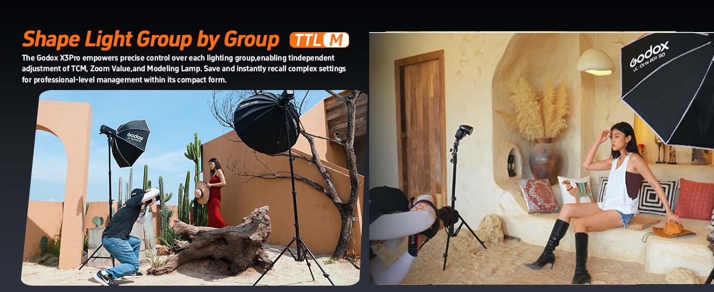Shape Light Group by Group: The Godox X3 Pro N trigger for Nikon empowers precise control over each lighting group, enabling independent adjustment of TCM, Zoom Value, and Modeling Lamp. Save and instantly recall complex settings for professional-level management within its compact form