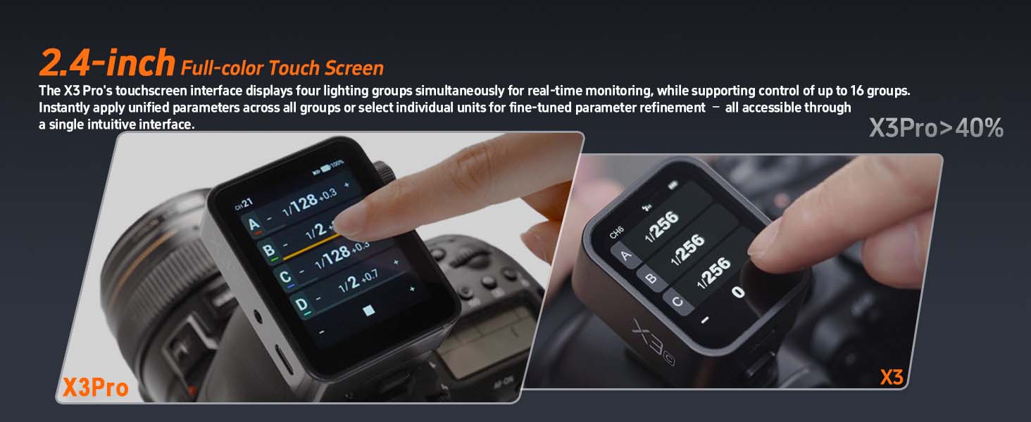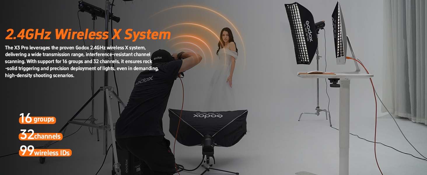 Godox 2.4GHz Wireless X System: The Godox X3 Pro leverages the proven Godox 2.4GHz wireless X system, delivering a wide transmission range, interference-resistant channel scanning. With support for 16 groups and 32 channels, it ensures rock-solid triggering and precision deployment of lights, even in demanding, high-density shooting scenarios