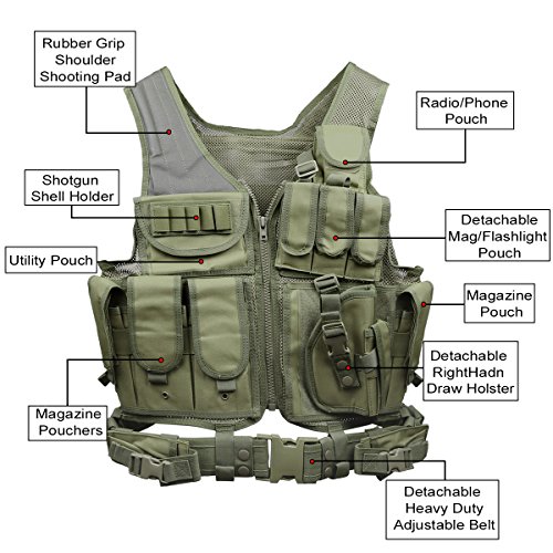 Details: Left outside 1x pistol holster for most medium-framed pistols 3x adjustable pistol mag pouches for most normal-sized mag Right outside 3x ammo pouches 1x large shell carrying pouch 1x shooting pad Inside 1x zip-up pocket on the left and right side