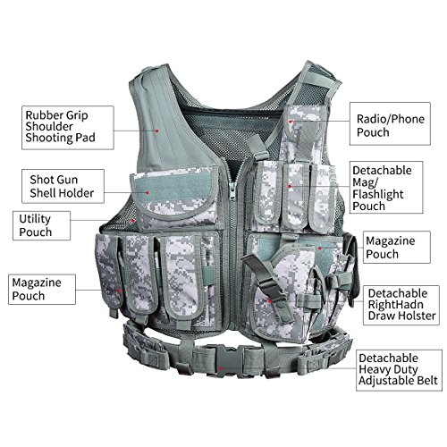 - There is a pistol holster for most medium-framed pistols, 3 adjustable pistol mag pouches for most normal-sized mag on left outside; there are 3 ammo pouches, a large shell carrying pouch, and a shooting pad on right outside. There is a zip-up pocket on the left and right side of the inside of the vest