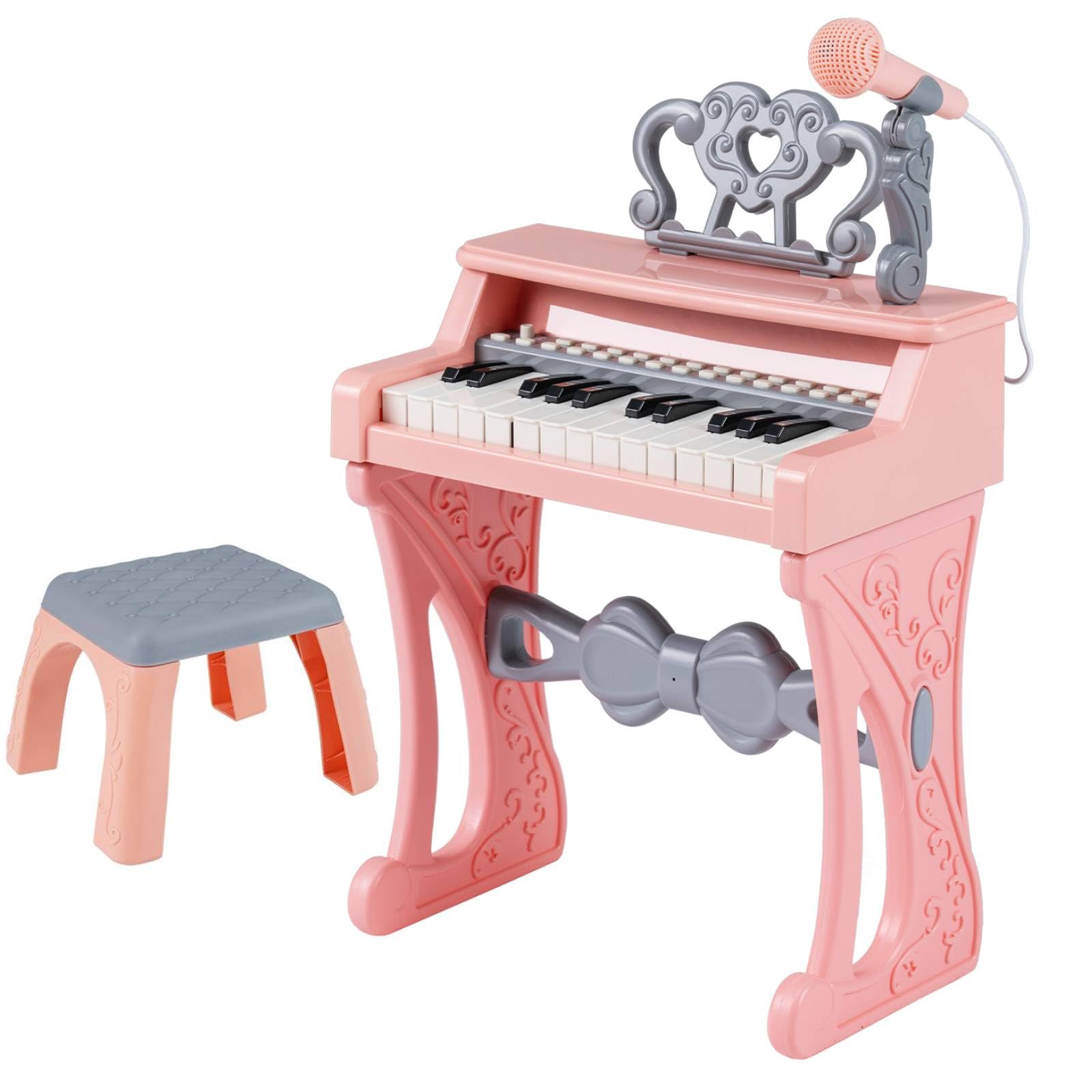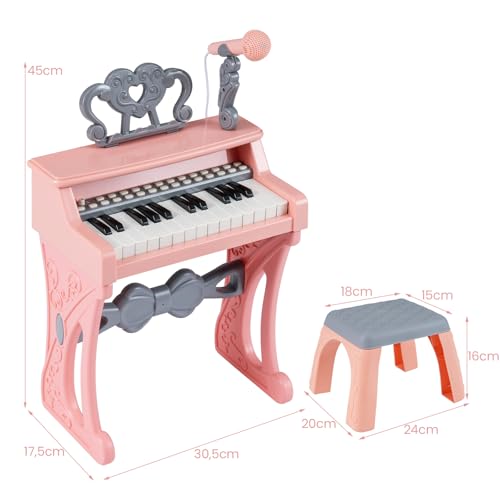 GYMAX Kids Piano Keyboard, 25 Keys Children Piano with Music Stand and Microphone, Educational Electronic Keyboard for 3+ Years Old (High Stand with Stool)