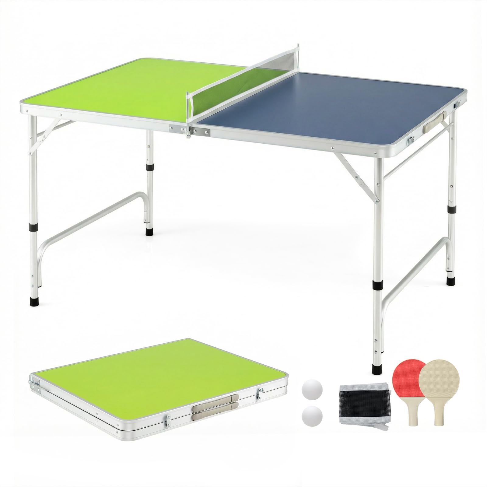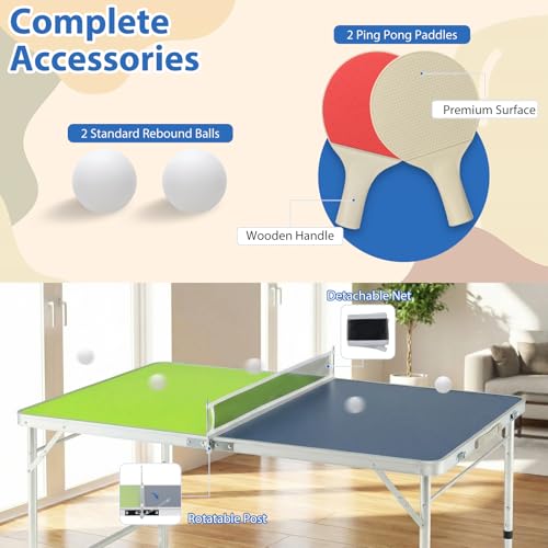 GYMAX Portable Ping Pong Table, Foldable Table Tennis Table with Aluminum Frame, Net, Ping Pong Balls & 2 Paddles, Height Adjustable Compact Game Tables for Indoor Outdoo