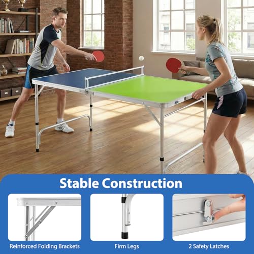 - ✔SAFE & STABLE BUILD- Constructed with a strong aluminum frame, firm legs and reinforced folding brackets, this foldable ping pong table provides reliable stability during play. It also includes 2 safety latches when folded to secure the table, ensuring safe storage and preventing accidental unfolding.
