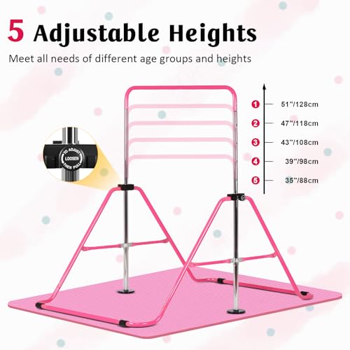 Adjustable Height Design: With five adjustable height levels (approximately 88–128 cm), the foldable gymnastics bar can grow with young gymnasts. It can be easily customized to fit each kid's height, ensuring long-lasting use throughout their developmental stages