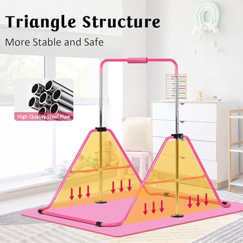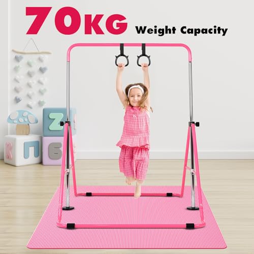 Safe & Sturdy: This gymnastics bar is built with thickened 25×1.2 mm steel tubing and a triangular frame design, supporting up to 70 kg for exceptional stability. Two round bases and four non-slip rubber floor rings increase friction to minimize wobbling, ensuring kids can play and train with confidence and safety