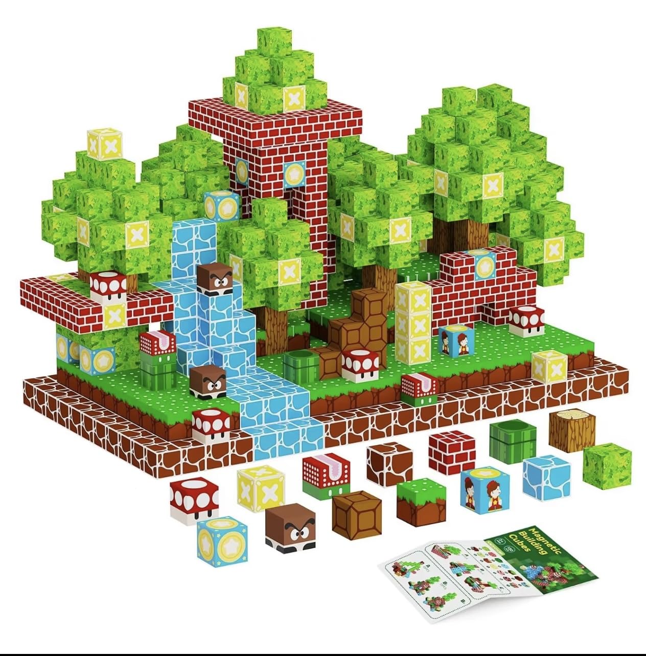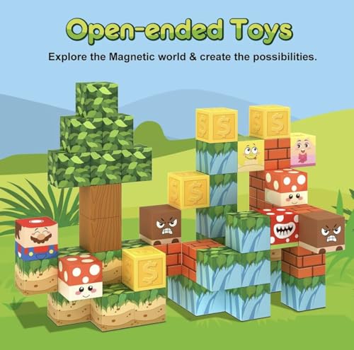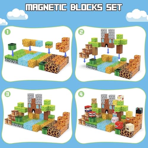 - COMPLETE BUILDING SET: 150-piece magnetic blocks set featuring pixelated game-inspired designs including trees, bricks, water blocks, character cubes, and terrain pieces for endless creative building possibilities