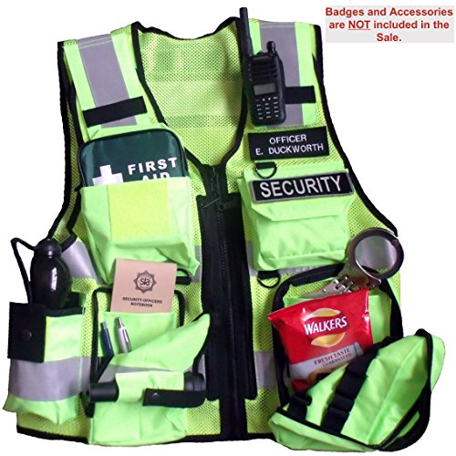 Please Note: The badges and accessories in the pictures are for demonstration purposes only and are not included in the sale. This adjustable Hi Viz vest is ideal for Security Officers, Community Wardens, Enforcement Officers, Dog Handlers , and First Aiders. It will fit sizes up to XXL and may fit a larger size depending on body shape and clothing worn underneath. Velcro adjustment on the shoulders and around the waist help you get the perfect fit. On the rear of the vest is a neat carry handle for when the vest is fully loaded. Beneath this is a velcro patch so you can fit your own badges. On the front you have two utility loops for a radio, mike, CCTV camera, or a Klick Doc adaptor. There are two velcro patches on the front – one for a standard size reflective Security/Dog Handler badge and the other for a name/rank or company logo badge. There is also a clear window pocket for your SIA Licence or other ID badges. The vest also has 4 ‘D’ rings for attaching keys etc. There is also a sleeve with securing strap for a small torch and a radio pocket with a removable elasticated securing strap. The pocket can also be used to carry a water bottle (see picture) if you don’t use a radio.