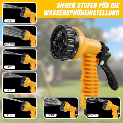 - 7 spray modes: the nozzle has seven different settings for the intensity and distribution of the water flow. The ergonomic handle is equipped with a snap-in system that allows for comfortable and precise pouring. It is ideal for watering lawns and gardens, washing cars, bathing pets, cleaning windows and doors and much more.