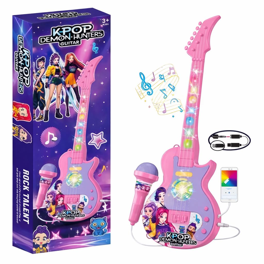 Hunter demons Light Up Guitar with Microphone, Pink Musical Toy Set with LED Lights, Children's Singing Guitar and Microphone Toy