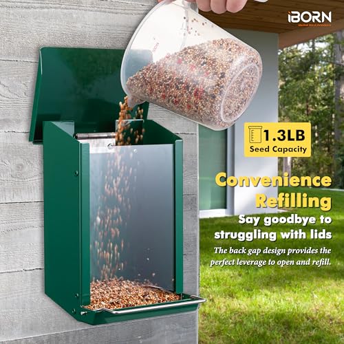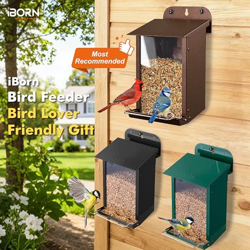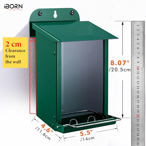 - 【Heavy Weighted Metal Bird Feeder For Outdoor Long-Lasting】This iBorn Bird Feeder For Outdoors offering significant advantages over traditional wall wooden feeders. It is constructed of hardness metal, with a protective rust-proof coating applied to its surface. Sturdy metal construction will avoid moisture damage, or chewing by squirrels. Resists wind, rain, and sun exposure, making it ideal for any weather and providing birds with a long-lasting feeding solution.