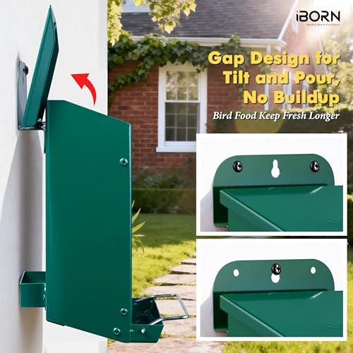 - 【Back Gap Design,Easy For Open Refill Effortlessly】This iBorn Wall Mounted Bird Feeder is designed with an innovative rear gap for improved functionality. When mounted on a wall, fence, or tree, the back of this bird feeder leaves a 2CM gap from the surface, ensuring it does not sit flush against it. You can easily refill seeds without taking the feeder down, simply lift the lid to pour. The lid won't hit the wall or fence behind it, making refilling smooth and hassle-free.