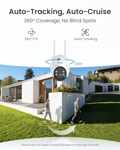 - Smart Auto Tracking with 360° Visibility and Coverage: ieGeek security camera ensures moving subjects are actively followed and captured and delivers full 360° visibility and coverage, keeping every angle of your property in view so nothing goes unnoticed. (Please note: you need to manually enable this feature in the app; only support horizontal tracking, doesn't support vertical tracking.)