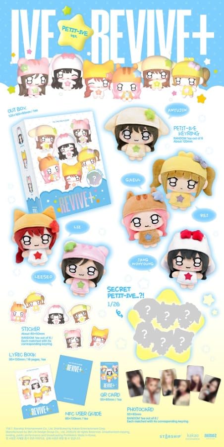 - Package : Out Box + Petit-IVE Keyring (Random 1 out of 6) + Lyric Book (16p) + Sticker (Random 1 out of 6) + Photocard (Random 1 out of 6) + QR Card + NFC User Guide