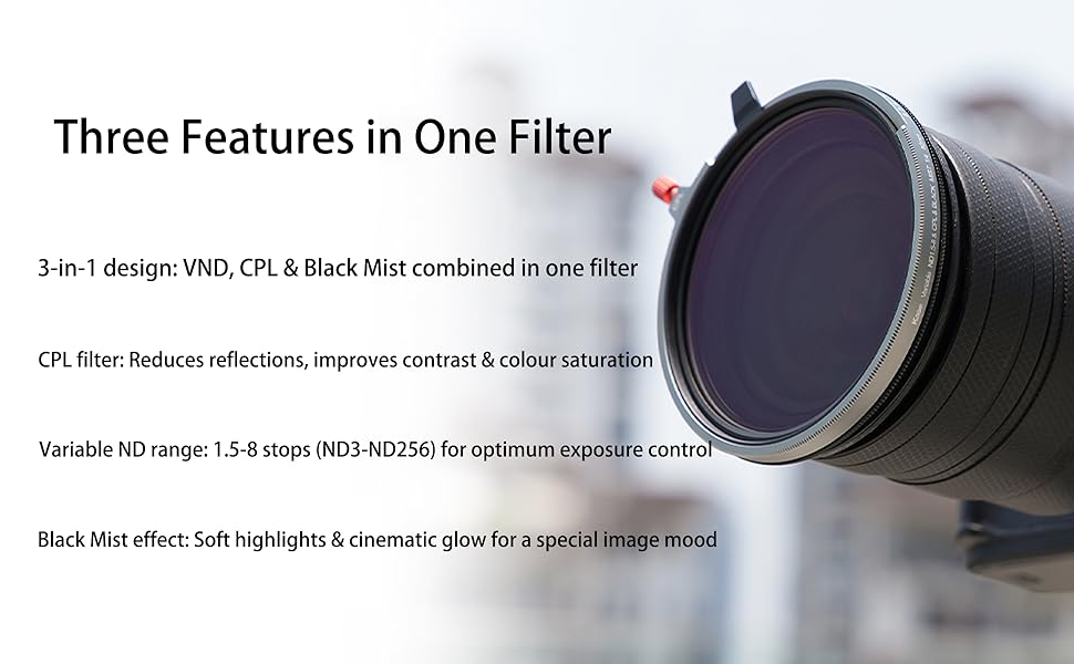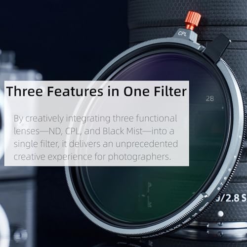 - Having a Variable ND (ND1.5-8 stops, or 3-236 ), a Circular Polarizer (CPL), and a Black Mist 1/4 all combined into one designed unit is a game-changer for speed and efficiency in the field. Your no longer have to stack or swap three separate filters, saving your precious time and reducing my reliance on post-production.