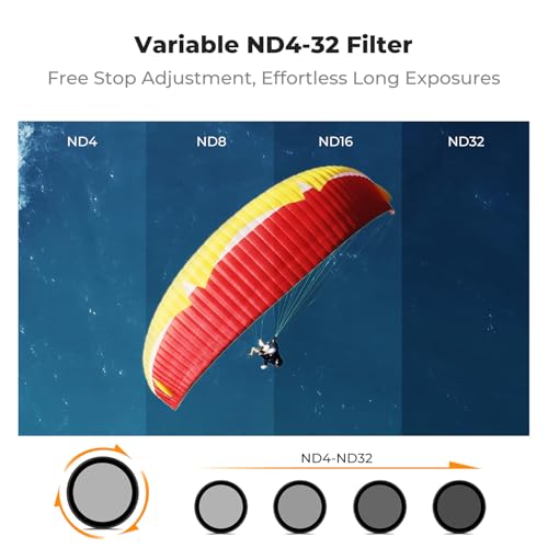 - [Flexible Exposure Control] The ND4-32 filter allows you to lower shutter speed, creating a smooth motion blur effect during fast-paced outdoor activities. This adds a dynamic sense of speed and impact to your videos. The ND4-32 (2-5 stops) is ideal for medium-light conditions, from partly cloudy to bright sunny days.