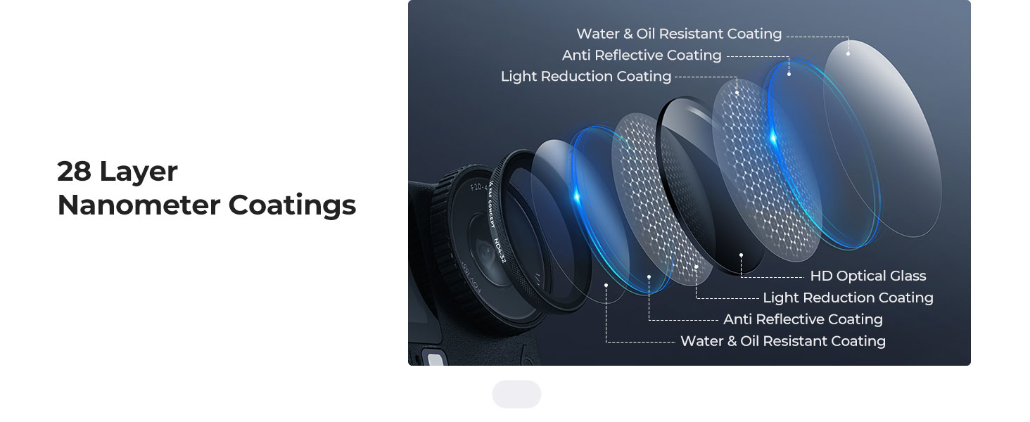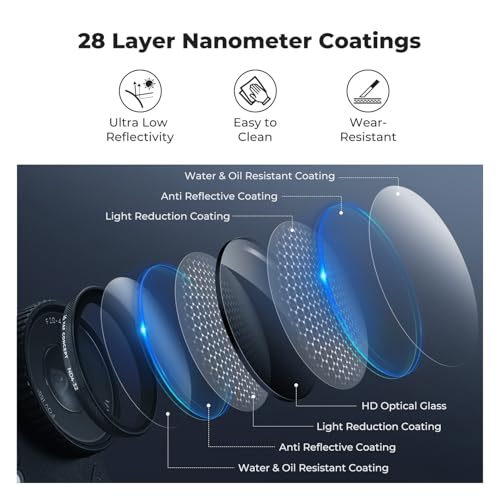 - [Premium AGC Optical Glass with Nano Coating] Crafted from high-definition AGC optical glass, featuring 28 layers of nano-coating on both sides. This ensures minimal reflectivity without compromising image clarity or sharpness. The coating is also water-repellent and scratch-resistant, offering extra protection for your lens.