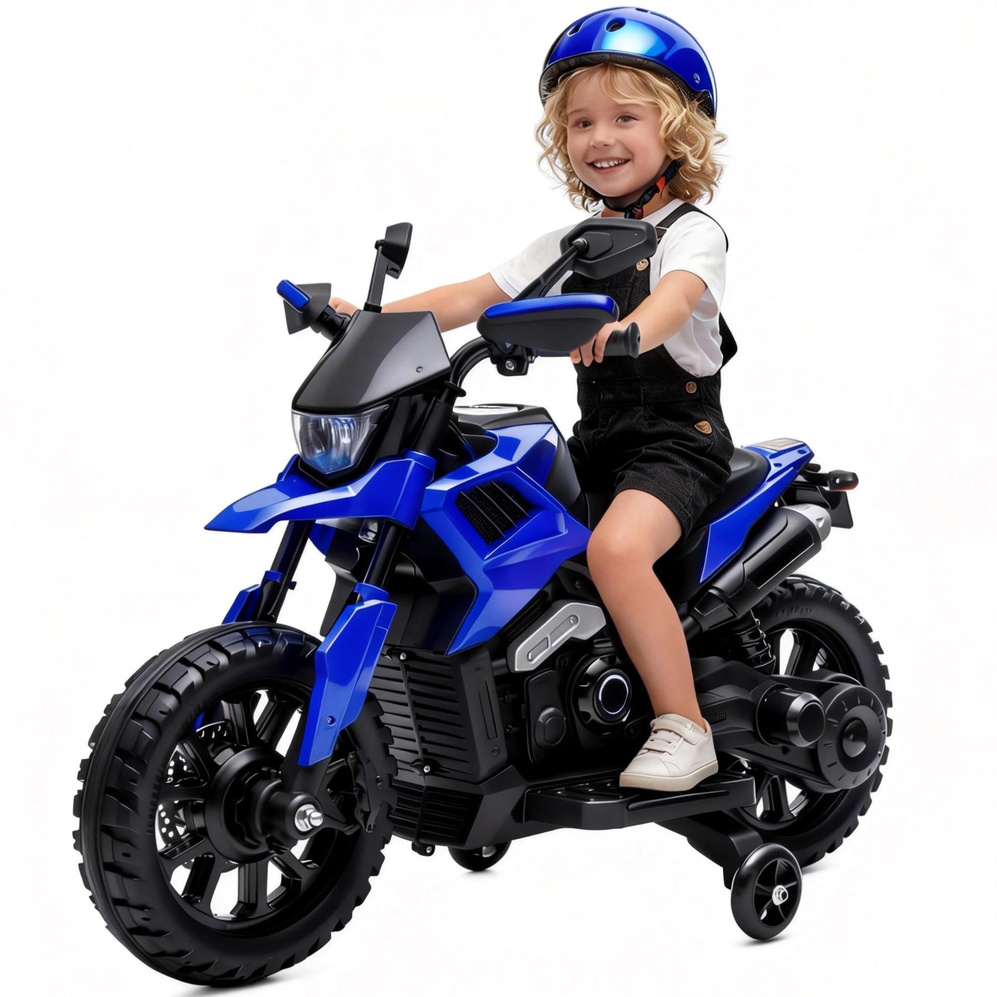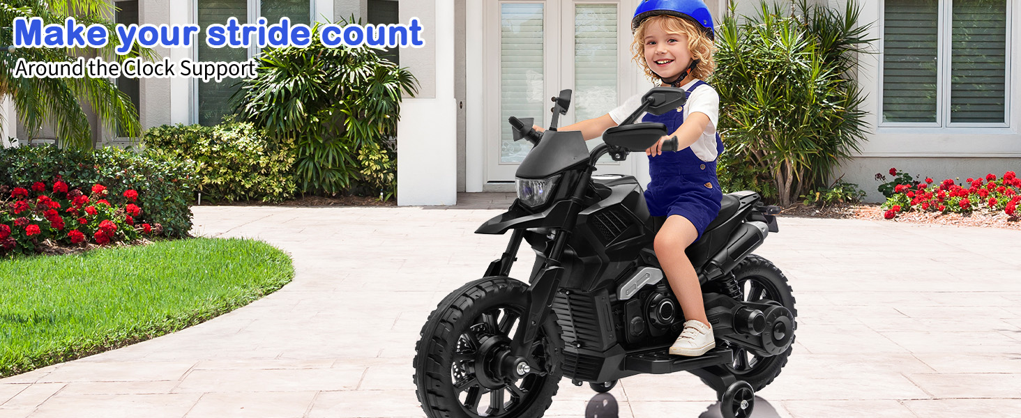 Safety Training Wheels & Great Details: This kids motorcycle has two training wheels for balance during practice. It also has one-button start, hand acceleration, Bluetooth, music, two reflectors, LED lights and a racing foot brake for an authentic racing feel.