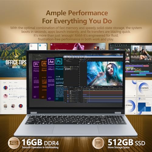- 【Large Memory Laptop: 16GB RAM 512GB SSD】The 15.6inch laptop 2 in 1 is equipped with 16GB DDR4 memory which not only has excellent performance, but also has the advantage of low power consumption. And the laptop also with 512GB SSD, the reading and writing speed is greatly improved compared to ordinary solid state drives, and files and videos can be saved at will. This Win11 laptop can handle daily office work and video editing quickly and efficiently, and game loading is also one step faster, and program switching is still smooth without lag.