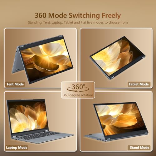 - 【15.6-inch Large Touch Screen Laptop & 360° Flip Design】This Win 11 laptop is equipped with a 15.6-inch Full HD IPS large display, and screen usage rate of up to 92%, 2.75mm narrow bezel design, and a resolution of 1920 × 1080P, which can present realistic colors and gorgeous images. The ultra-thin laptop 2 in 1 adopts a versatile 360° flip design and a high-precision 10-point touch screen, so you can switch freely between laptop mode and tablet mode, bringing you a comfortable viewing experience and higher work efficiency.