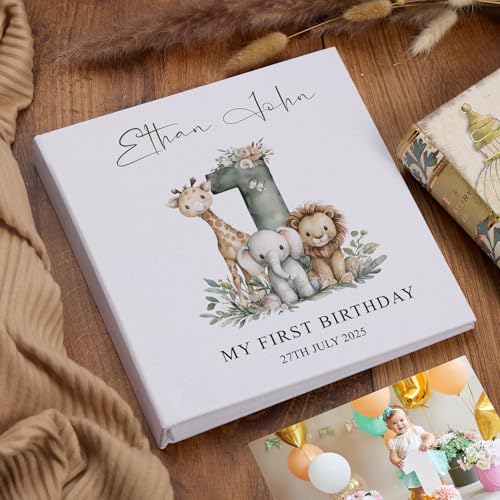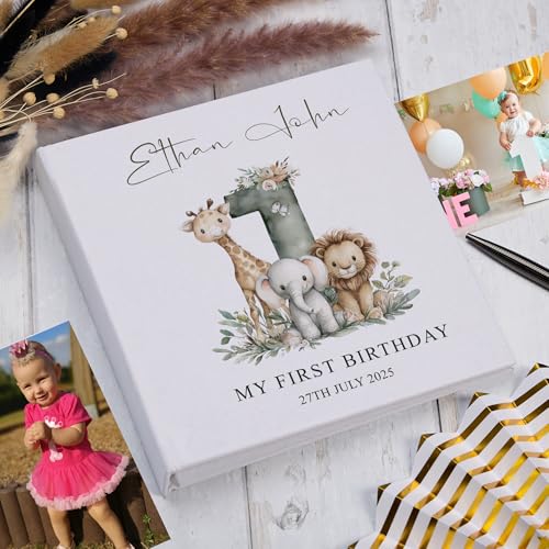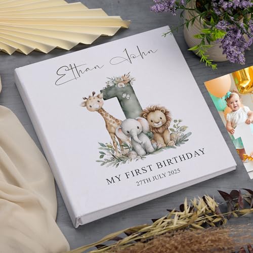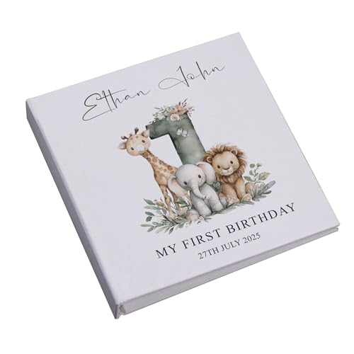 PERSONALISED FIRST BIRTHDAY KEEPSAKE: Customisable linen cover featuring charming safari animals design with space for your child's name and birth date, creating a bespoke memory book to treasure for generations