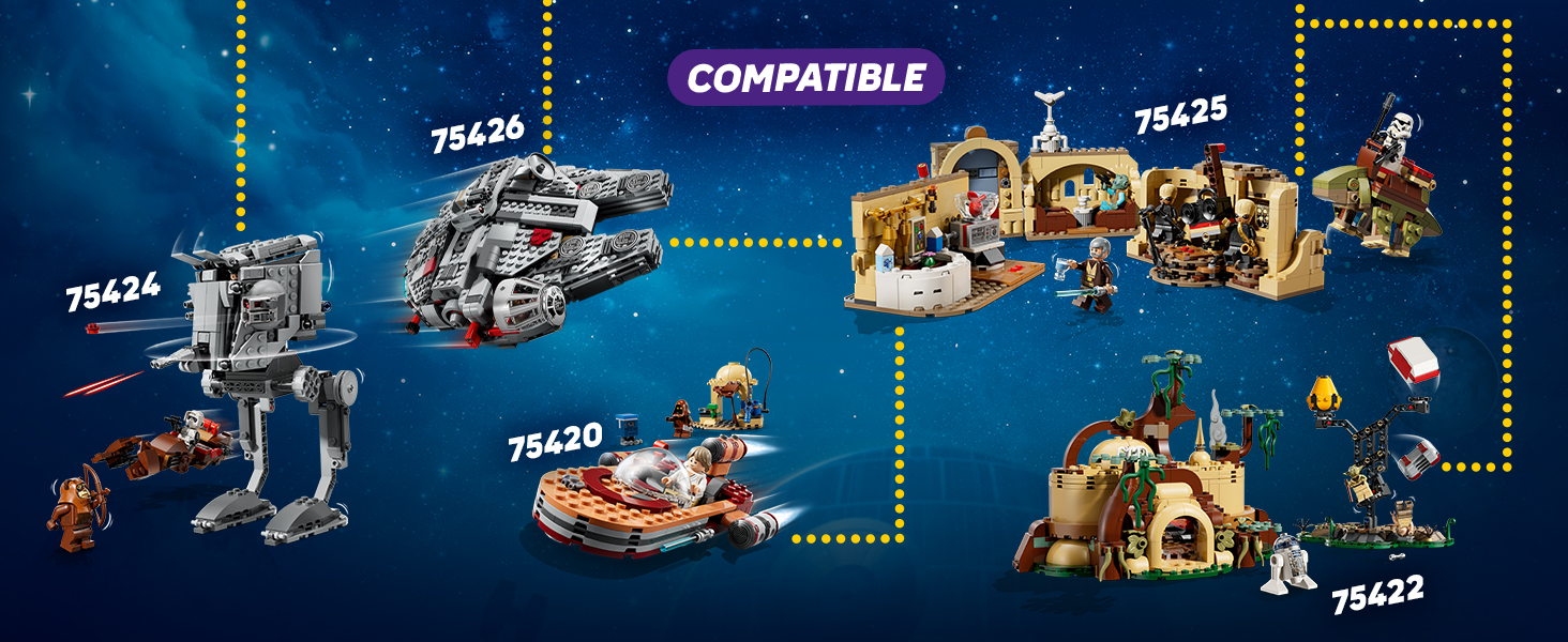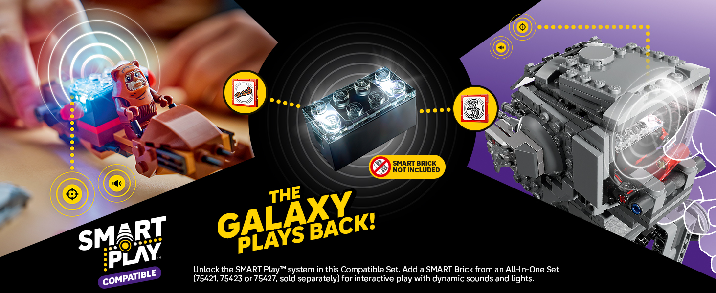 - THE GALAXY PLAYS BACK – When connected to the SMART Tag on the AT-ST or speeder bike, a LEGO SMART Brick (not included) responds to motion and colours with engine noises, AT-ST walking sounds, and laser shooting