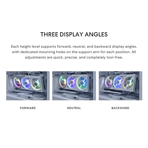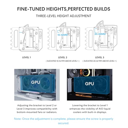 Three Height Adjustments for Optimal Clearance: The latest V4 version of the bracket features a larger cutout for the GPU I/O, significantly reducing interference with HDMI and DisplayPort cables. This thoughtful design allows you to angle your GPU forward for improved cooler clearance or backward to showcase its aesthetic appeal.