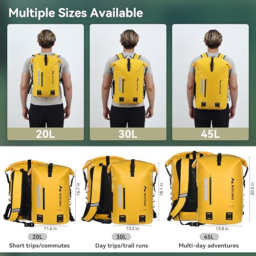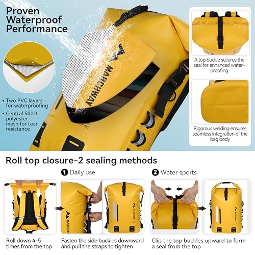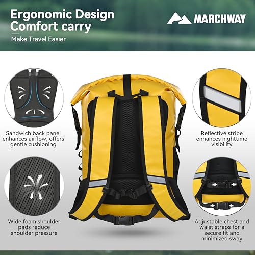 MARCHWAY Roll Top Waterproof Backpack, Floating Dry Bag 20L/30L/45L with Ergonomic Rectangular Base, Cushioned Back, Hip Strap, Gear Loops, MOLLE for Hiking Camping Kayaking Travel (Yellow, 45L)