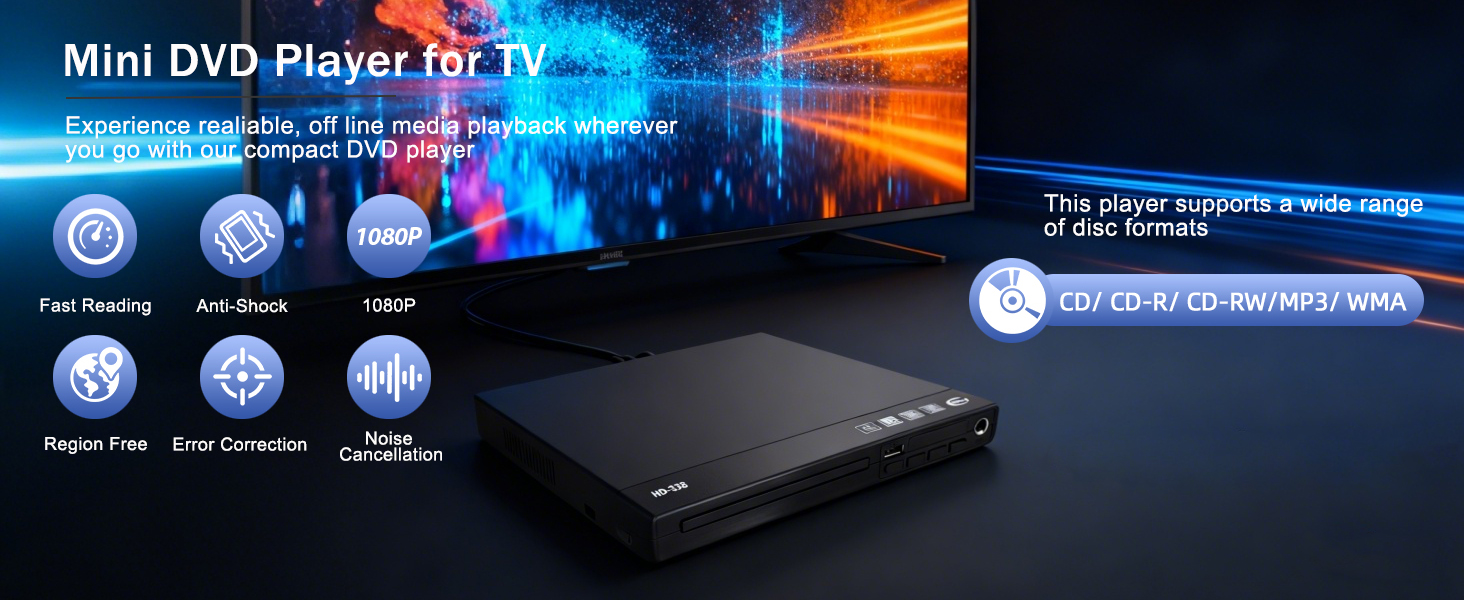 All-Region & Multi-Format Disc Playback: As a true region free DVD player, it supports all region codes (0-7) for global DVD compatibility. This small DVD player also plays a wide range of disc formats including DVD, CD, VCD, SVCD, DVD±R/RW, and CD-R/RW, making it a highly versatile multi region DVD player for your media collection.
