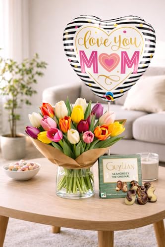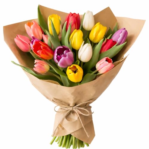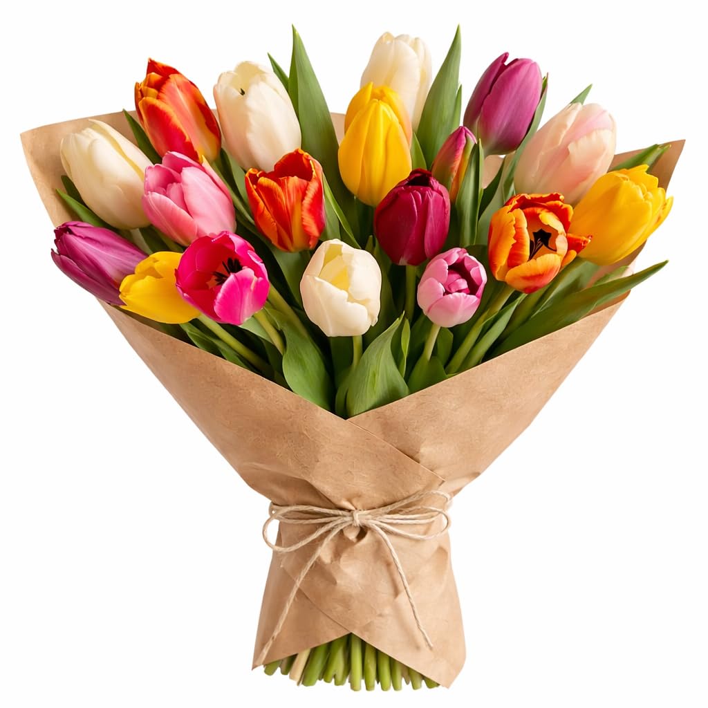 This mixed-colour tulip bouquet features fresh-cut tulips in seasonal shades, including pink, yellow, white, orange, and red. Each bouquet is arranged by hand and wrapped in recyclable kraft paper to present a simple and natural finish. Tulips are supplied fresh and may arrive partially closed, opening gradually over time. As a natural product, variations in stem length, bloom size, and colour distribution should be expected. The bouquet is available as a standalone floral arrangement or paired with optional additions, including chocolate, a balloon, or both. These options make the bouquet suitable for birthdays, celebrations, or thoughtful gifting occasions. Flowers are supplied without a vase. Basic care guidance is included to help maintain freshness after arrival.