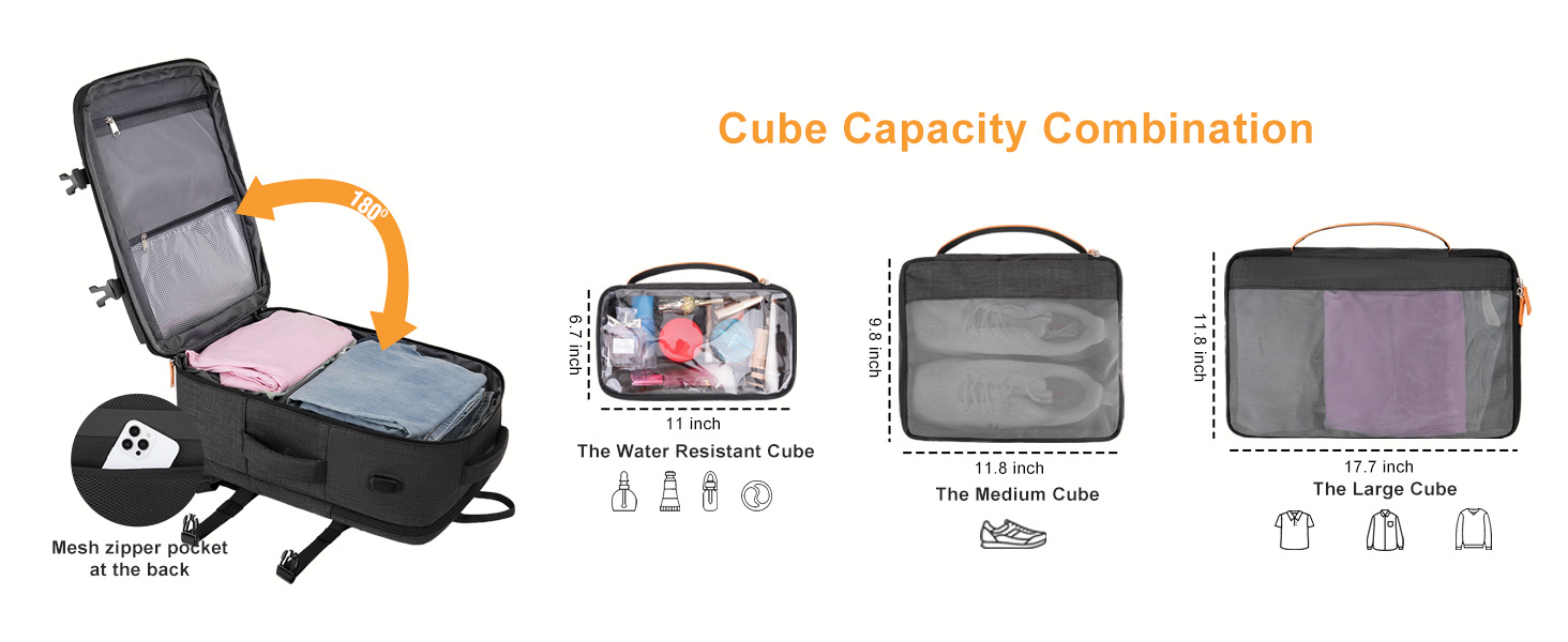 Multi Compartment Design: This backpack has a main compartment, 4 front zipper pockets and comes with 3 packing cubes. Holds about 40L. The main compartment features a full 180-degree opening with wet / dry zippered pockets, providing plenty of room for clothes, toiletries and travel essentials. Front 4 zipper pockets is great for quick-access and store cell phone, pen slots, wallet, keys and other small items. The back compartment is a laptop compartment that can fits up to 17.3 inch laptop.