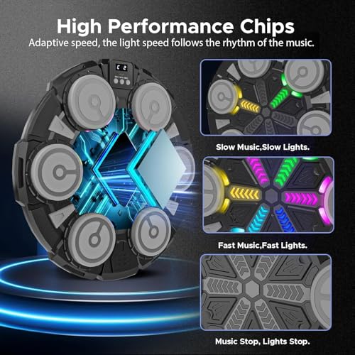 LED Target Lights for Real-Time Feedback: This smart boxing machine features responsive LED lights that guide your punches and provide instant visual feedback, helping improve your reaction time, precision, and coordination. Bluetooth Music Playback for Rhythmic Training: Pair your device via Bluetooth and enjoy immersive workouts with music. This boxing machine turns any space into a rhythm-based fitness zone, encouraging movement and cardio activity.