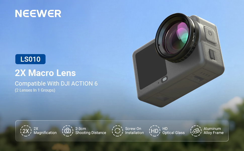 NEEWER Macro Lens Compatible with DJI Osmo Action 6 Only, Action Camera Close Up Photography Accessories with 2X Magnification, 2 Elements 1 Group, 2-3cm Focus Range, LS01