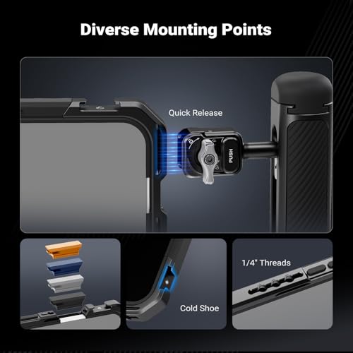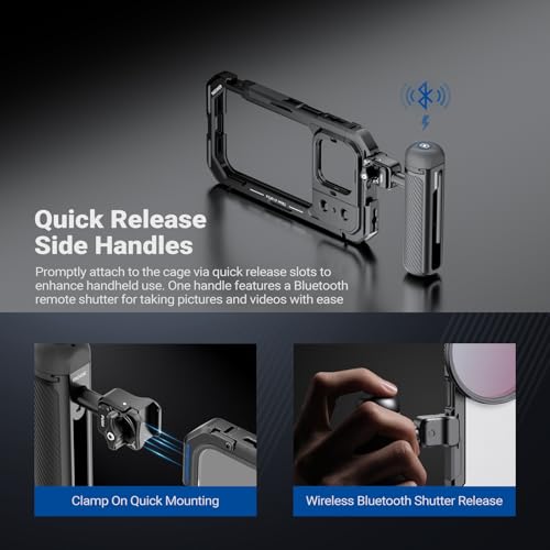 【Quick Release Bluetooth Handle】 Promptly attaches to the cage via quick release slots to enhance handheld use. The Bluetooth remote shutter allows easy picture and video captures