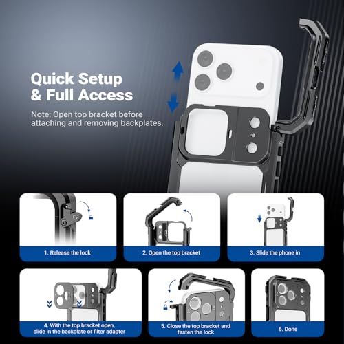 【3 Interchangeable Backplates】 With a 67mm filter ring, 17mm threaded phone lens backplate, and T mount lens backplate (compatible with Moment) for creative shots. Note: Open top bracket before mounting backplates. Filters and lenses not included