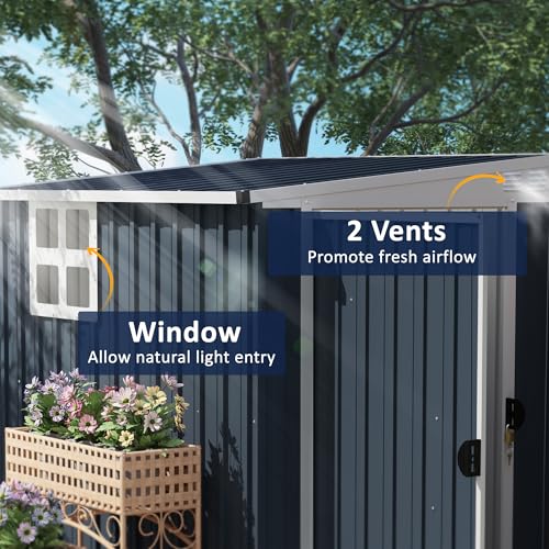 - Ventilated & bright: Stay organised with this outdoor shed, designed with two ventilation vents for optimal airflow and a transparent window to flood the inside with natural light. Great for keeping your garden tools and supplies fresh and dry.