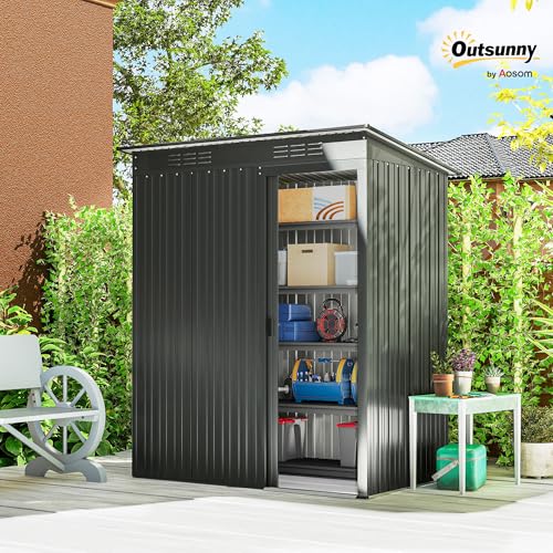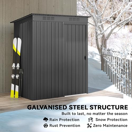 Outsunny 5 x 3.5ft Metal Garden Storage Shed with Effortless Assembly and 2 Pairs of Gloves, Waterproof Outdoor Shed with Sliding Door, Vents and Pent Roof for Furniture Tools Bike Storage, Dark Grey