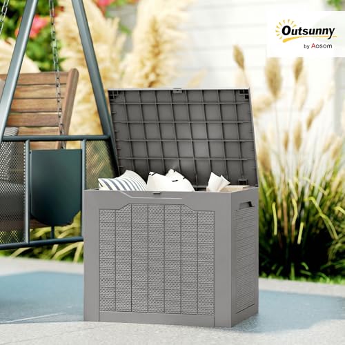 Discover the ease of outdoor tidying with the Outsunny Garden Storage Box. Effortlessly portable with two recessed handles, this waterproof outdoor storage box is secure with a built-in padlock loop. Crafted from weather-resistant polypropylene, it's the smart solution for decluttering your garden or patio space. Great for storing all your garden accessories and tools safely.