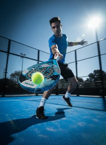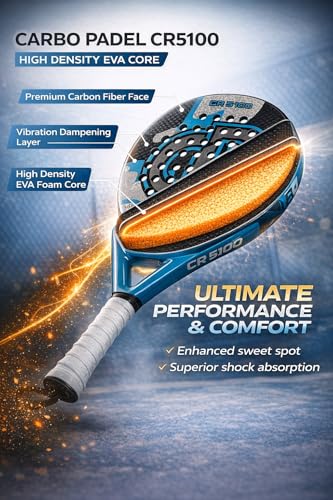 Elevate your padel tennis game with the Carbo Padel CR 5100 Professional Padel Racket. This high-performance racket features a cutting-edge design combining a carbon fibre frame with a 3K carbon face, delivering exceptional durability and power on every shot. The innovative EVA Pro Core with a 38mm profile provides optimal balance between control and power, while the Flat Lock System ensures consistent ball contact. The racket’s distinctive design includes Flat Face Technology for precise shots and enhanced spin control. A high-grip cushion handle offers superior comfort and control during intense matches, complemented by the Vibra Lock System that reduces unwanted vibrations. The striking blue and grey aesthetic features a unique pattern that stands out on the court. Built to dominate, this professional-grade racket is perfect for players seeking to enhance their performance with advanced technology and superior construction. Whether you’re serving, volleying, or smashing, the CR 5100 delivers the perfect blend of power, control, and precision for competitive play.