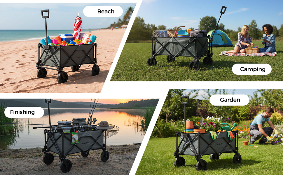 The folding trolley with wheels is perfect companion for your daily use and outdoor adventures! Ideal for garden, beach, camping, grocery, shopping, sports, fishing, park, barbecues.