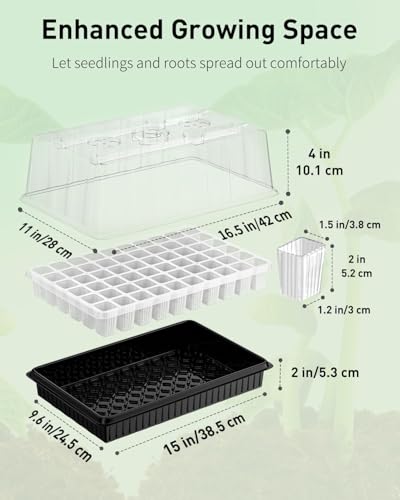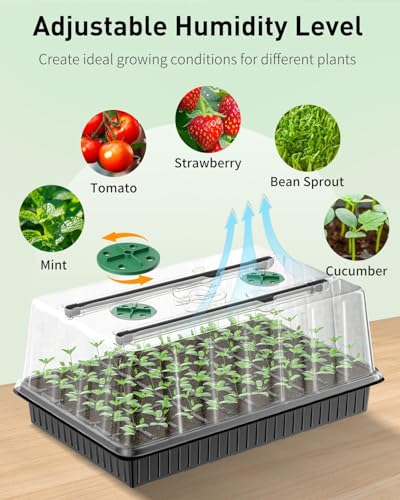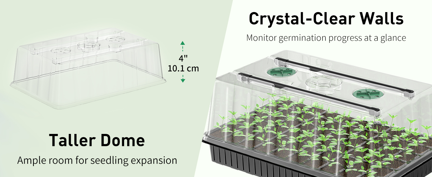 Enhanced Growing Space: The 10.1 cm tall humidity domes on the seedling starter trays ensure ample vertical room for seedling expansion. Simply rotate the vent caps to adjust interior humidity levels from 50% to 100% for optimal moisture control