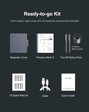 WHAT'S IN THE BOX – Your Penstar eNote Pro color e-ink tablet bundle comes with a high-precision and premium aluminum-alloy Digital Stylus B6, an extra 10 nibs spare kit, a magnetic folio protect cover, a USB-A to USB-C cable, and a quick start guide. Everything you need to start writing right out of the box.
