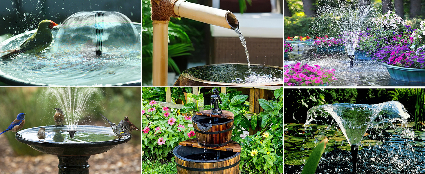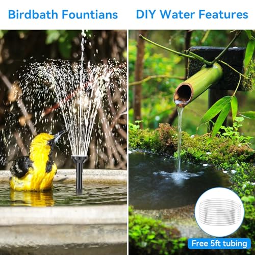 - [✔8 Spray Modes & 5Ft Tubing]: The solar powered bird bath fountain comes with various nozzles for different spray modes. We also provide a 5ft tubing for creating a variety of water features such as waterfall, bubblers, stream or other DIY water circulation.