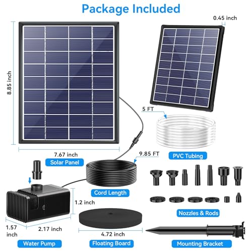 - [✔Easy to Install]: The solar powered water pump is plug and play, once the solar panel in direct sun, it will start working auto within seconds. The solar panel equipped with 180° rotatable ground stake which can be inserted to the ground or mounted on the wall. The pump can be float on the water with floating foam or submerged under water with suckers.