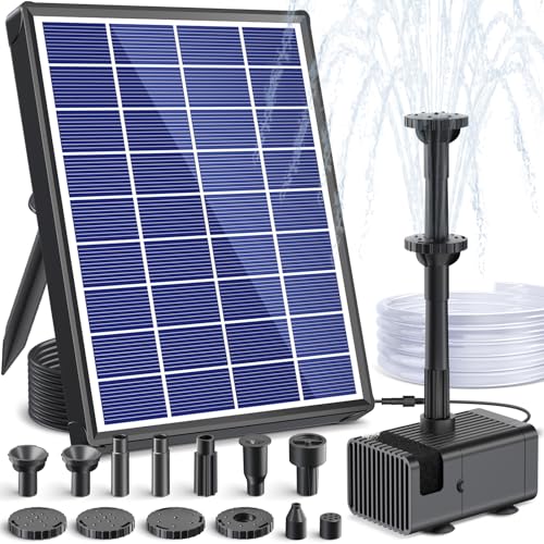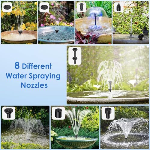 - 【DIY Solar Water Pump Kit】Our solar fountain pump comes with 8 nozzles that can spray in different water styles and jet height to match various fountains and meet your ideas. Also, we provide the 4ft water pipes for creating different water features such as waterfall, small stream, birdbath, hydroponic garden, irrigation or other DIY running water.