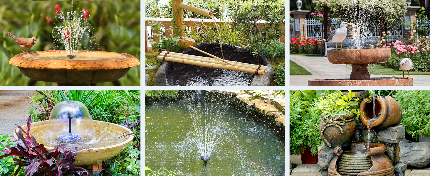 Solar Fountain Pump is perfect suitable for outdoor ponds, fish tanks, fountains, waterfalls, garden water features, bird bath, hydroponics, aquaponics, greenhouses and other garden decoration.