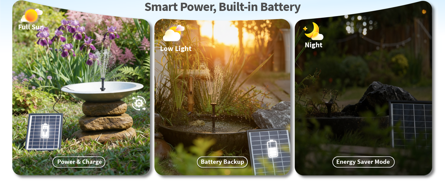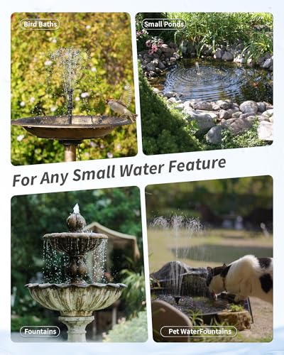 Stable Daytime Operation & Attracting Cute Animals- The combination of solar panel and built-in battery ensures the solar water fountain operates stably during the day with solar energy. You can rest assured knowing the water environment maintains a flowing state when your birds and fish need it most during daytime hours.