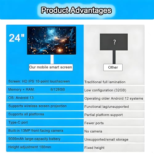 ★ Smart touchscreen displays, portable displays, mobile smart screens, portable touchscreen TVs, and monitors with stands. Unlike traditional screens or TVs, smart screens feature universal wheels, allowing them to be with you anywhere.