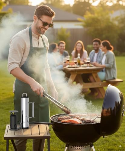 GET REAL SMOKE IN SECONDS | Effortless Flavor Infusion Forget the hassle and long wait of traditional smokers. The LAZYFOX Smokit delivers rich, consistent smoke with just 4 easy steps: add your fuel, plug in the power, turn on the air pump, and ignite. You'll get steady smoke in seconds, making it perfect for both spontaneous grilling and all-day smoking events.